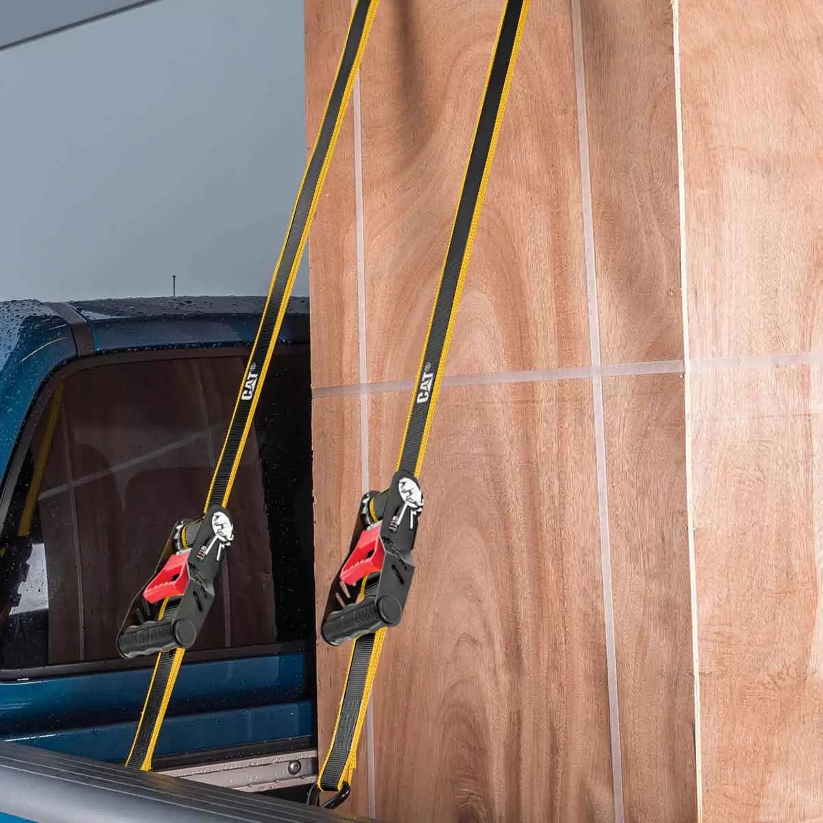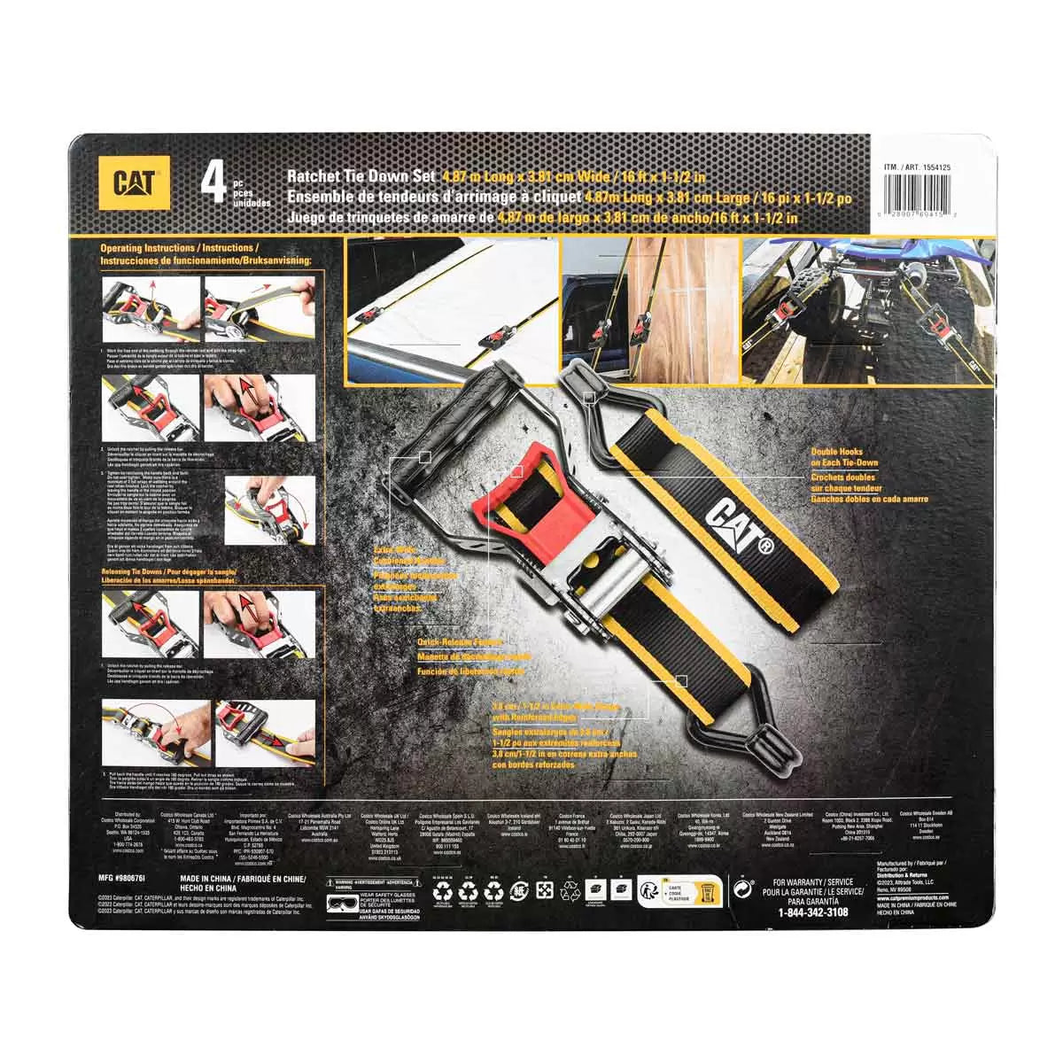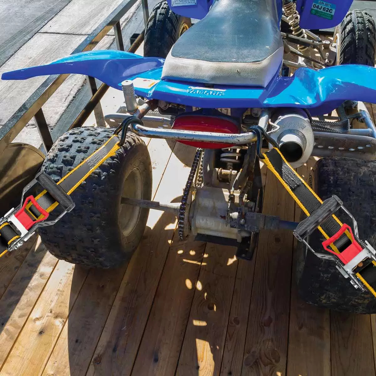 4-piece set of super duty 1.5" x 19" ratchet tensioners for secure securing of furniture, equipment, ATVs, motorcycles, side-by-side UTVs, golf carts, lawnmowers and more. Each strap is designed for 1362 kg breaking strength and 454 kg load capacity. The yellow straps are made of durable polyester webbing that resists stretching, tearing and rotting. The double steel J hooks do not bend like individual hooks and provide extra security when attached to equipment, trailers and vehicles. And the hooks are rubberized to prevent scratches on expensive cars and devices. The ratchet handles are shaped and will not fall off.