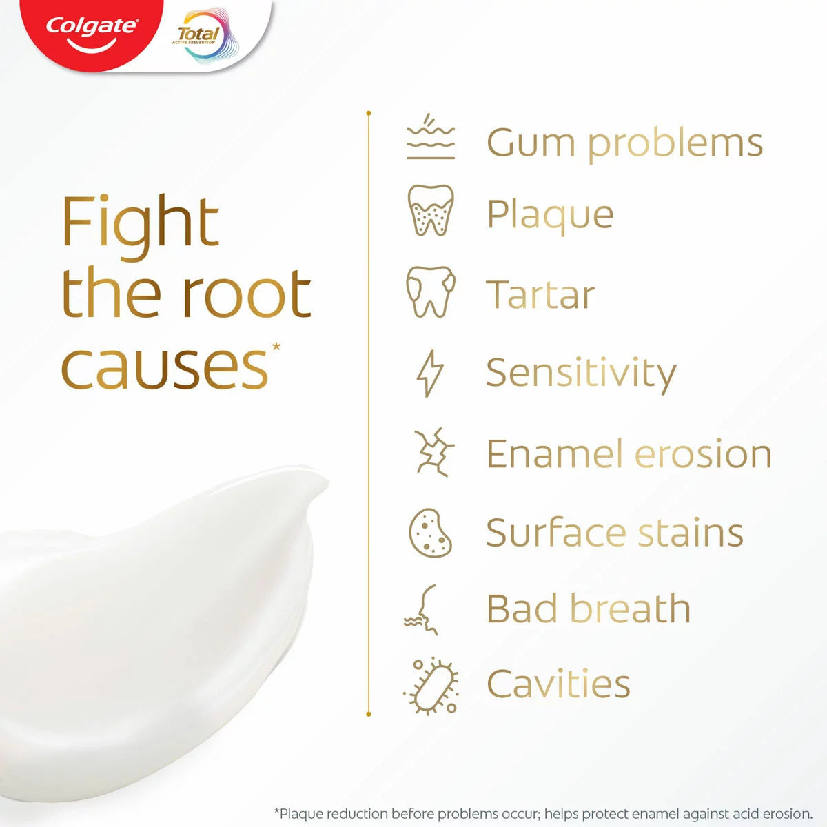 Beyond teeth cleaning, the powerful, patented², preventative technology in Colgate’s Total Active Prevention Original Toothpaste helps with 8 oral health problems: