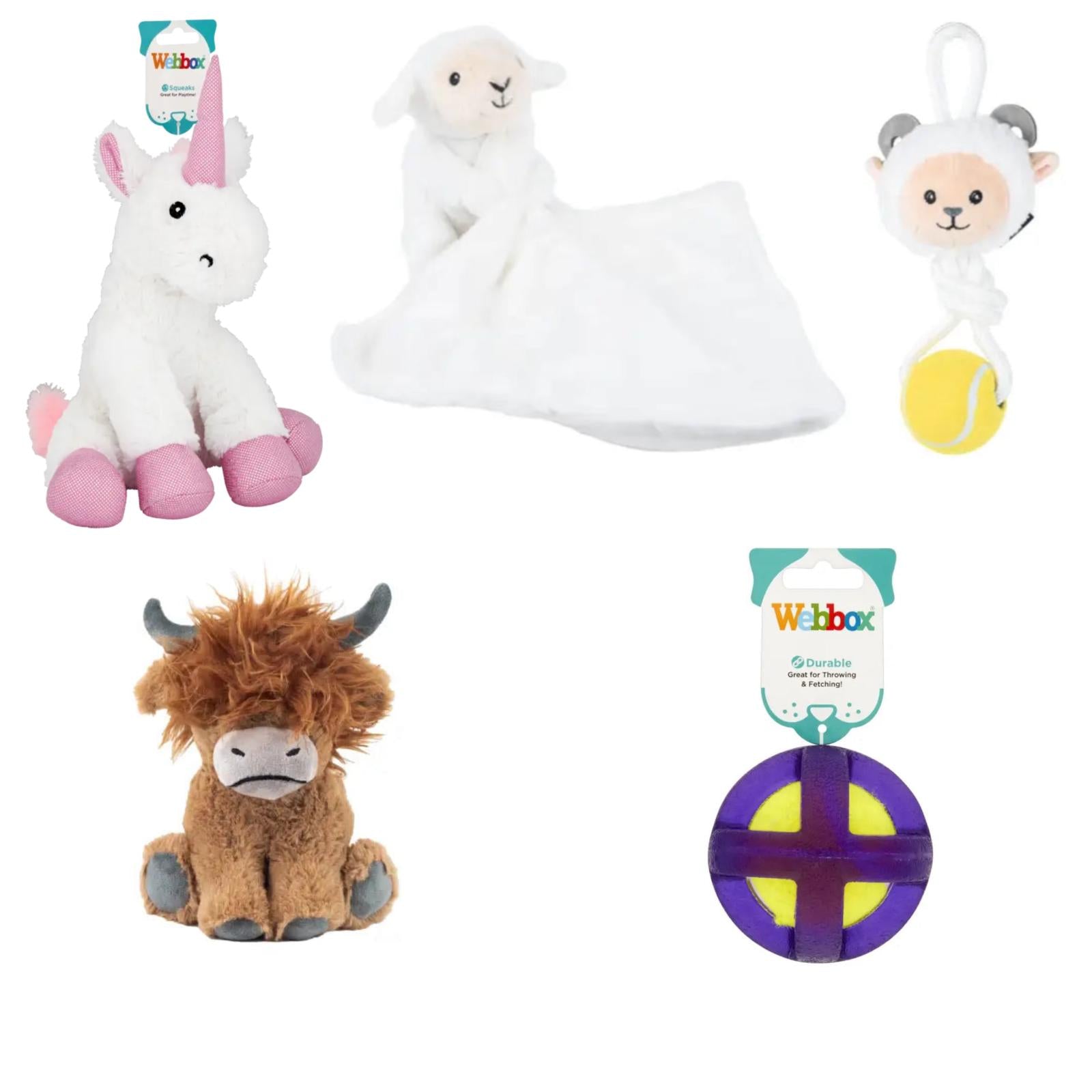 Webbox Cage Ball, Plush Unicorn, Ropw & Ball Goat, Puppy soothing Blanket Lamb, Cuddle Higland Cow, Dog Toy