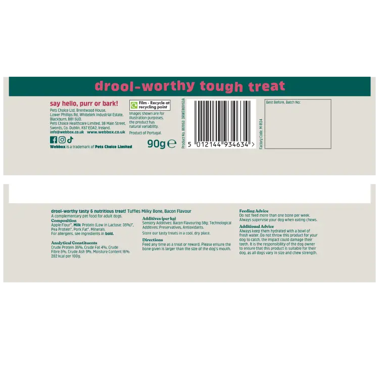 . Whether for rewarding good behaviour, training, or simply giving your dog a tasty chew, the Webbox Tuffies Milky Bone with Bacon is a delicious and digestible option.